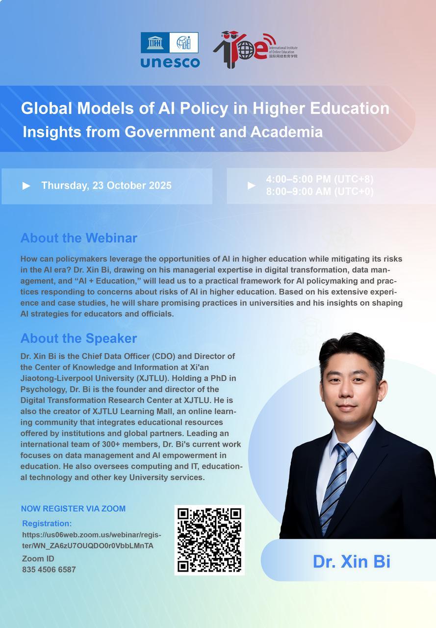 About the Speaker Dr. Xin BI is the Chief Data Officer (CDO) and Director of the Center of Knowledge and Information at Xi'an Jiaotong-Liverpool University (XJTLU). Holding a PhD in Psychology, Dr. BIi is the founder and director of the Digital Transformation Research Center at XJTLU. He is also the creator of XJTLU Learning Mall, an online learning community that integrates educational resources offered by institutions and global partners. Leading an international team of 300+ members, Dr. BIi's current work focuses on data management and AI empowerment in education. He also oversees computing and IT, educational technology and other key University services. What You Will Learn A core framework for AI policymaking and practices at the institutional level How do different countries and universities design their policies for AI strategies How do governments, technological firms, and universities interact and cooperate in national AI strategies (NAIS) across various countries Case studies on promising practices in leading universities and colleges. Event Information Date: Thursday, 23 October 2025 Time: 4:00 - 5:00 p.m. (UTC+8) / 8:00 - 9:00 a.m. (UTC+0) Language: English Registration: https://us06web.zoom.us/webinar/register/WN_ZA6zU7OUQDO0r0VbbLMnTA ZOOM ID: 835 4506 6587